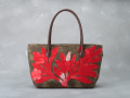 ムラの大きな赤のアップリケは手染めのため、二つとして同じ物のない色合いです。下地は深いこげ茶色のエクストラダークブラウンを使用しています。