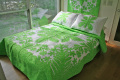 アップリケはパステルグリーンのむら染めで、バックグラウンドはスーパーホワイト生地でカラーゴーディネートしました。デザインはシルバーソードという植物なのですが、むら染め独自の色合いのためまるで生きているようで、マイナスイオンが湧き出ているような仕上がりです。寝室を明るくすることはいうまでも無く、観葉植物を飾る感覚でお部屋のコーディネートをされてはいかがでしょうか。