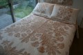 当店のキルトはすべて人の手で丁寧に縫われた本物の作品で、ウエーブ(さざ波のように縫う技法)の間隔は約5ミリから10ミリで細かく縫われています。またキルトは立体的なのですが、不必要な「バブル」(きちんと縫われていないために出るダブつき)ができないように充分注意して作成しています。また、一枚一枚日本人の目で、検針および品質の確認をしていますので、安心してご使用ください。