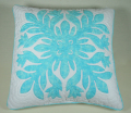 真っ白な海底をキャンバスに、海面を通し投影された波のきらめきのような美しいムラ染めパステルブルーを使用した手縫いの大きいサイズハワイアンキルトクッションカバーです。