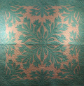 当店のキルトはすべて人の手で丁寧に縫われた作品で、ウエーブ(さざ波のように縫う技法)の間隔は約5ミリから10ミリで細かく縫われています。またキルトは立体的なのですが、不必要な「バブル」(きちんと縫われていないために出るダブつき)ができないように充分注意して作成しています。
