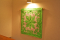 さわやかで深みのあるパステルグリーンのムラ染め生地を使い、ハワイ固有種のシルバーソードという植物をモチーフにした60センチ角ハワイアンキルトタペストリーです。このサイズは、玄関や階段の踊り場、マンションの柱にもちょうどいい大きさです。玄関を明るく飾ってくれるだけでなく、手縫いで丹精こめて作られた立体感のあるタペストリー(壁掛け)はお客様の評判になることでしょう。