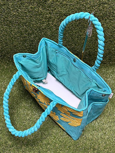 49. ハワイアンキルト レッスンバッグ スランティングハイビスカス イエロー オン ターコイズブルー