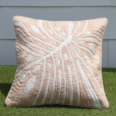 29a. ハワイアンキルトクッションカバー45cm角 リアルモンステラ ベージュ オン オフホワイト