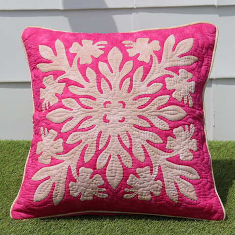 38. ハワイアンキルトクッションカバー45cm角 ハイビスカス ベージュ オン Sピンク