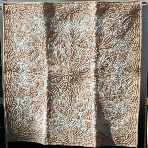 人気のむら染めを使用した、ハワイのアンスリウムという植物をモチーフにしたハワイアンキルトタペストリーです。このむら染めはベージュとオフホワイトの色あわせをしました。最上段の画像のように壁にかけて暖色系のスポットライトを浴びせますと落ち着いた金色にも見える大変美しい色合いです。当店のむら染めはすべて店長自ら生地を選び色あわせ(カラーコーディネート)をしています。むら染めは、光の当たり具合で色の濃淡が変化する大変美しい生地です。隅々まで丁寧に仕上げられたハンドメイドの逸品をお楽しみください。