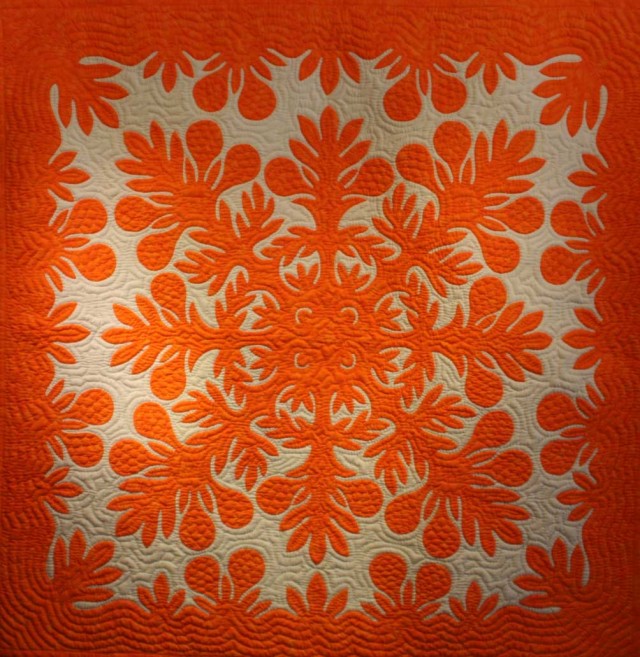 富の象徴とされるブレッドフルーツをモチーフに、明るいむら染めオレンジと白のファブリックでコーディネートしました。パンの実の一つ一つを見てください。表皮のつぶつぶを繊細に手縫いの刺繍で表現しています。白いファブリックにも細かく丁寧にウェーブが作成されています。お部屋を明るくしてくれる一枚です。