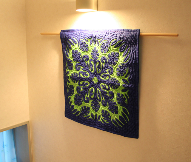 このサイズのハワイアンキルトはプロのキルターが約1ヶ月かけて手縫いで製作します。斜めから撮影した画像を見ていただければ、手縫い独特のふくらみを感じていただけるとおもいます。